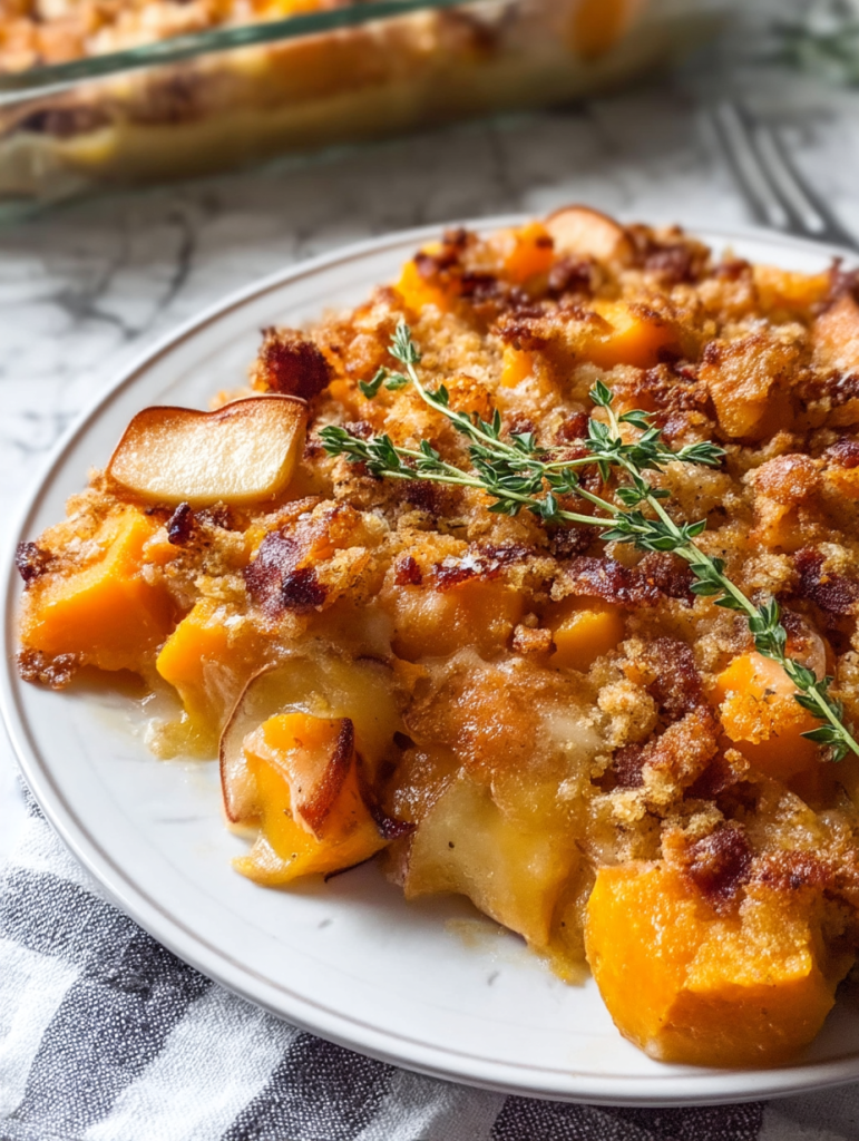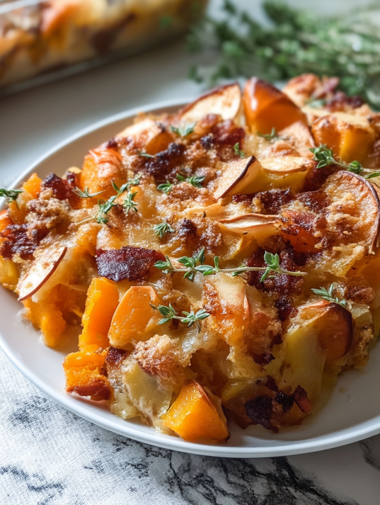 The natural sweetness of the apples balances beautifully with the nutty depth of butternut squash, while the savory bacon and herbs keep every bite interesting. This dish is hearty enough to be the star of your plate, yet versatile enough to complement roasted meats, poultry, or vegetarian mains.