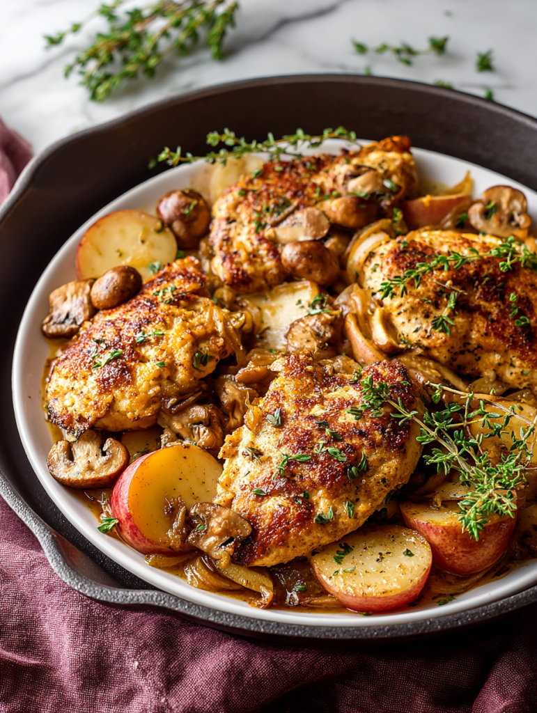Golden, pan-seared chicken breasts nestled into a rich medley of caramelized onions, crisp apple slices, and fragrant fresh thyme — the Autumn Harvest Chicken Skillet is the kind of cozy, rustic dinner that brings fall flavors straight to your table. With savory, sweet, and herbaceous notes all balanced beautifully in one skillet, it’s a one-pan wonder that’s as stunning to serve as it is satisfying to eat.