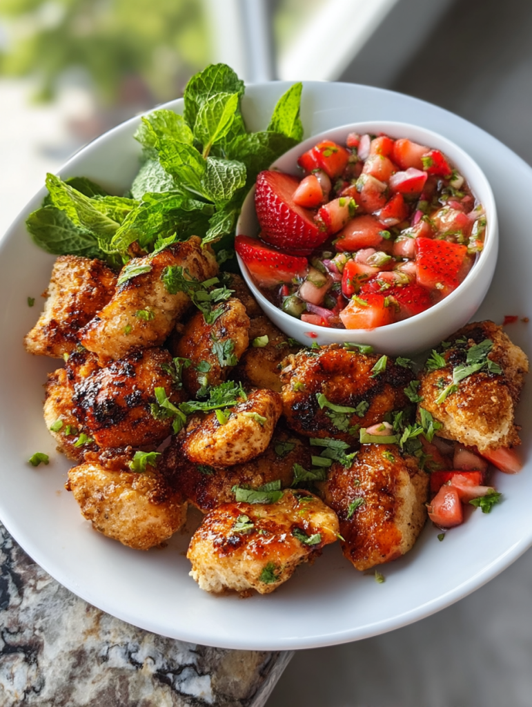 Add grilled chicken bites to a serving bowl and top generously with the strawberry salsa. Garnish with extra mint and a few jalapeño slices if you like it spicier.