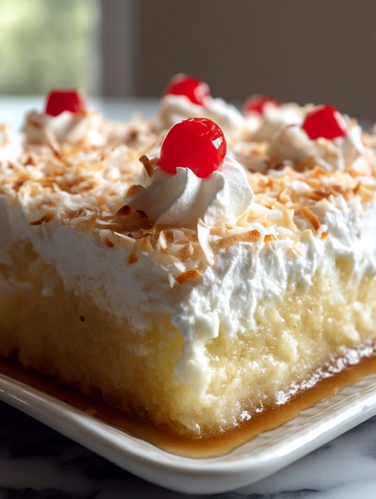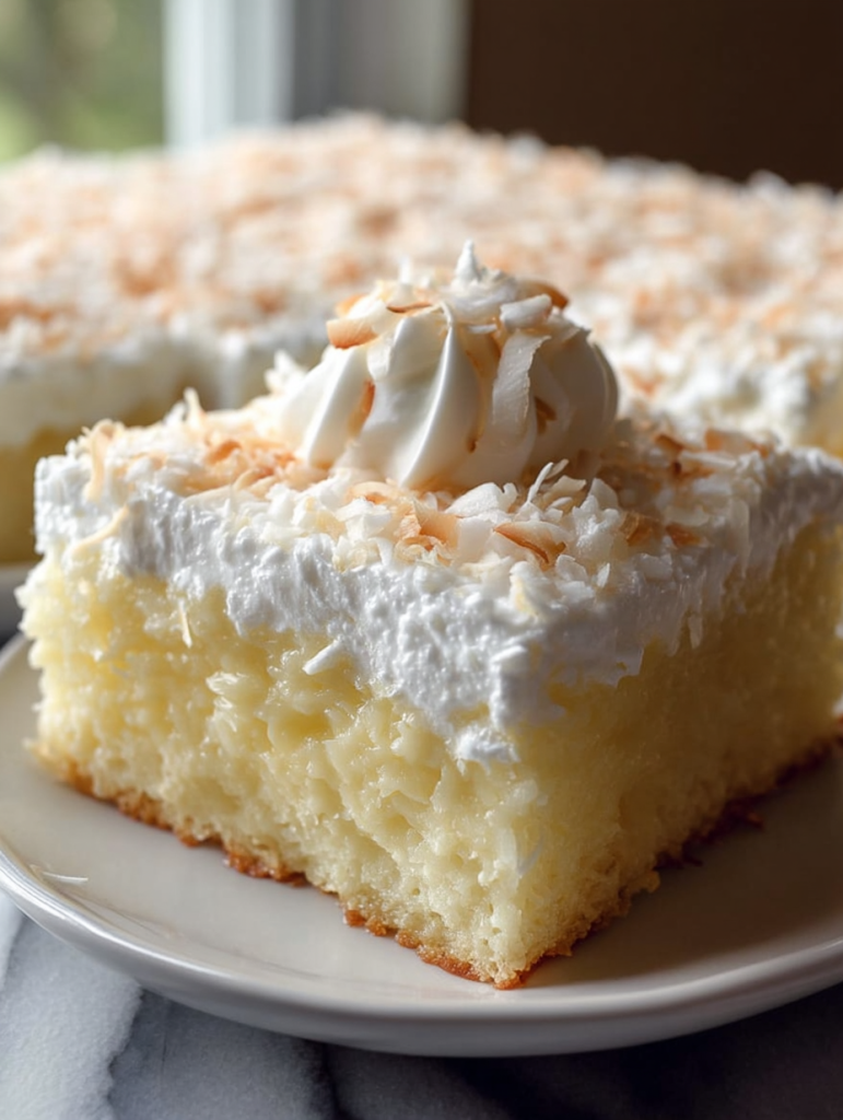 Moist, fluffy, and bursting with coconut flavor, this Coconut Poke Cake is the kind of dessert that instantly transports you to a tropical daydream. Each bite is infused with creamy coconut milk that seeps into every corner of the sponge cake, topped with a cloud of whipped cream and a generous sprinkling of toasted coconut flakes. It’s light, luscious, and beautifully simple.