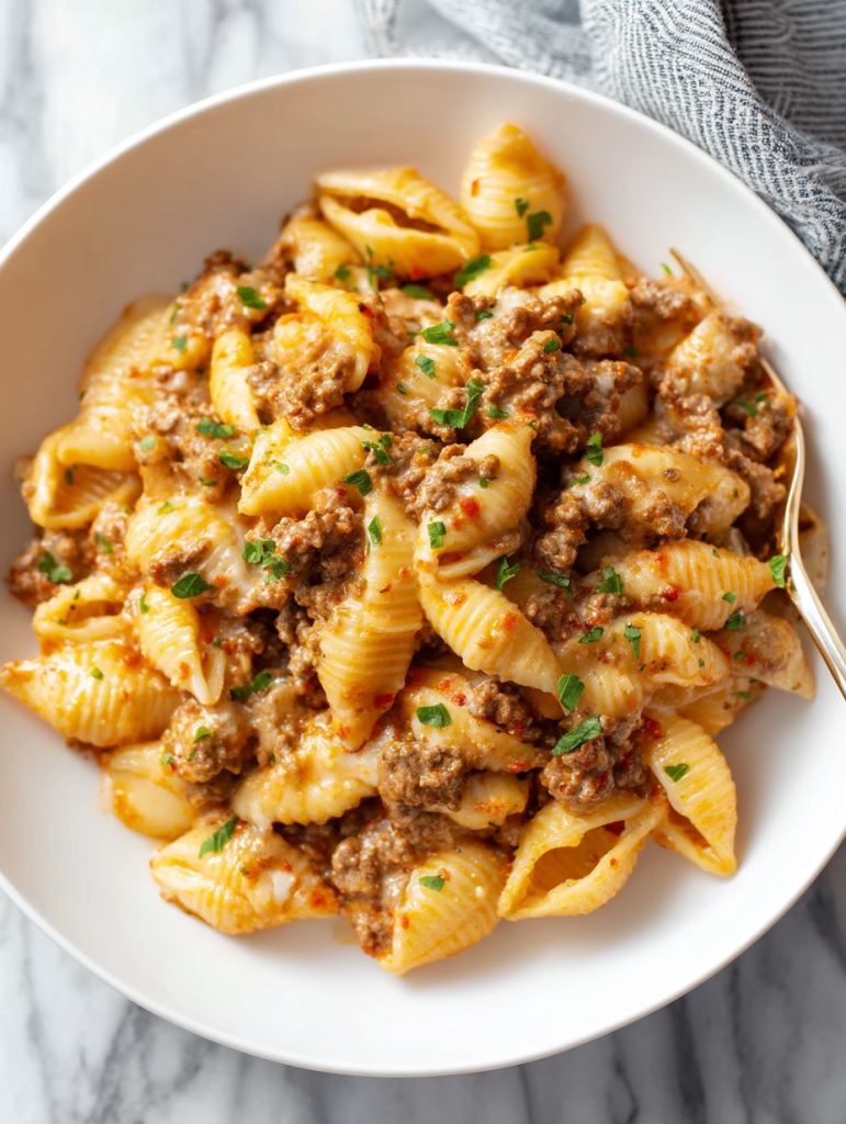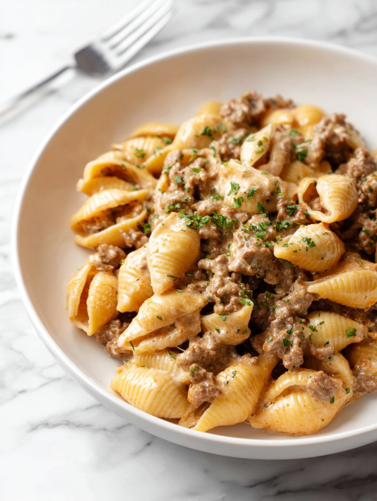 This dish takes inspiration from the classic Hamburger Helper but elevates it with a creamy twist and fresh ingredients. It’s made with everyday pantry staples, but the result is anything but ordinary. The smooth, savory sauce and shell pasta catch every drop of flavor, making each mouthful a cheesy, beefy delight.