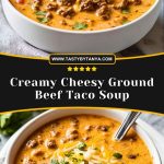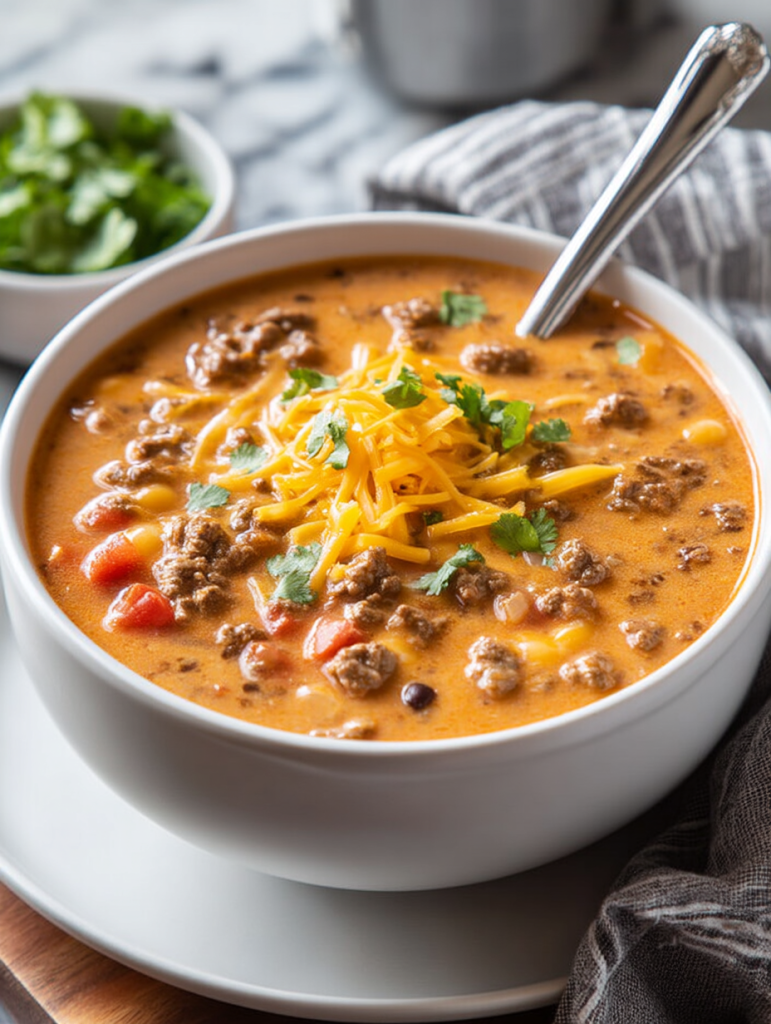 Keywords: easy dinner, taco soup, creamy soup, ground beef recipe, cheesy soup, quick weeknight dinner, family-friendly meal