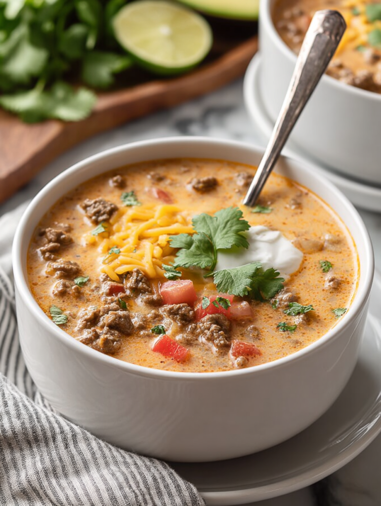 Get ready to fall in love with this *Creamy Cheesy Ground Beef Taco Soup*! It’s the perfect comfort food that brings together the bold flavors of tacos in a creamy, hearty soup that’s quick to make and impossible to resist. Packed with seasoned ground beef, tangy tomatoes, velvety cheese, and just the right amount of spice, this easy dinner idea is a dream for busy nights or lazy weekends. Whether you’re searching for a quick dinner, a cozy lunch, or new food ideas to add to your recipe box, this taco soup covers it all — a family-friendly, easy recipe that’s sure to become a staple!