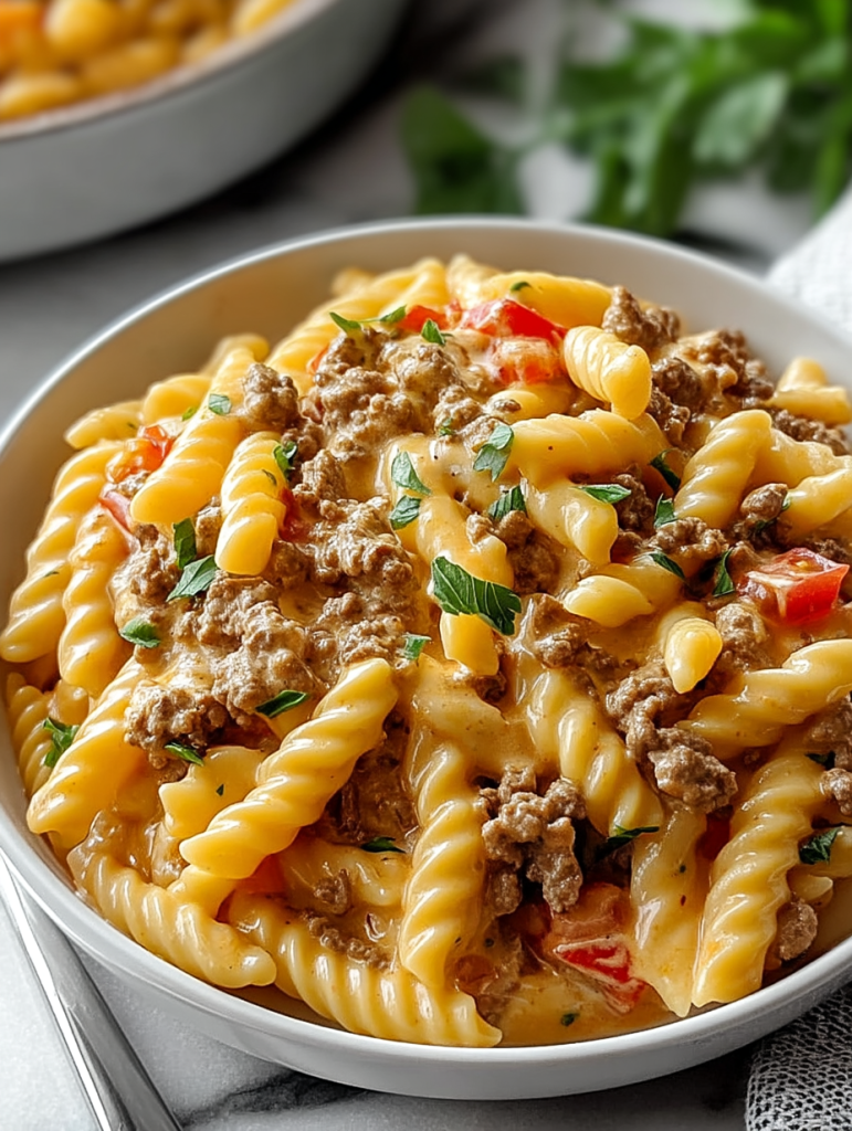Penne pasta is ideal for this recipe because its ridges hold onto the creamy sauce perfectly, delivering flavor in every bite. But feel free to swap in rotini, rigatoni, or even elbow macaroni. The goal is to use a short pasta that can trap all that cheesy, beefy goodness.