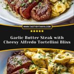 Keywords: garlic butter steak, tortellini Alfredo, quick dinner, creamy pasta, comfort food