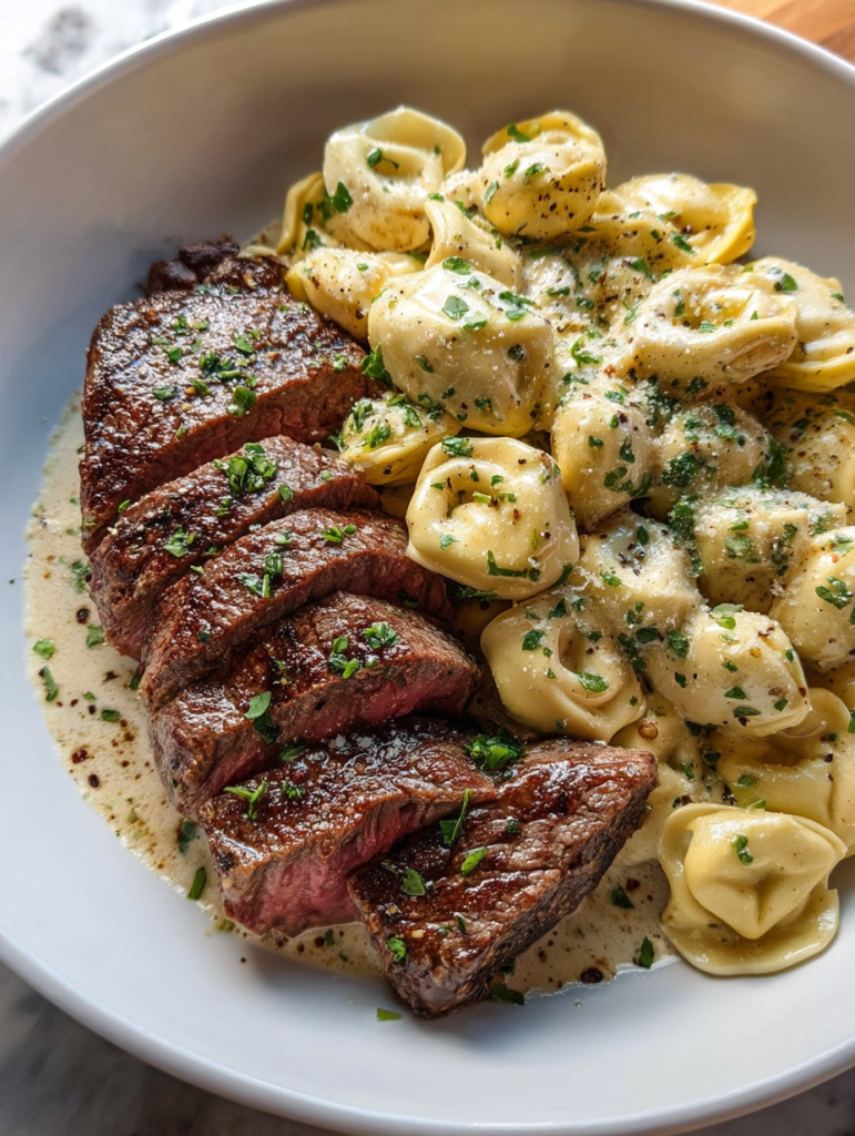 Garlic Butter Steak with Cheesy Alfredo Tortellini Bliss