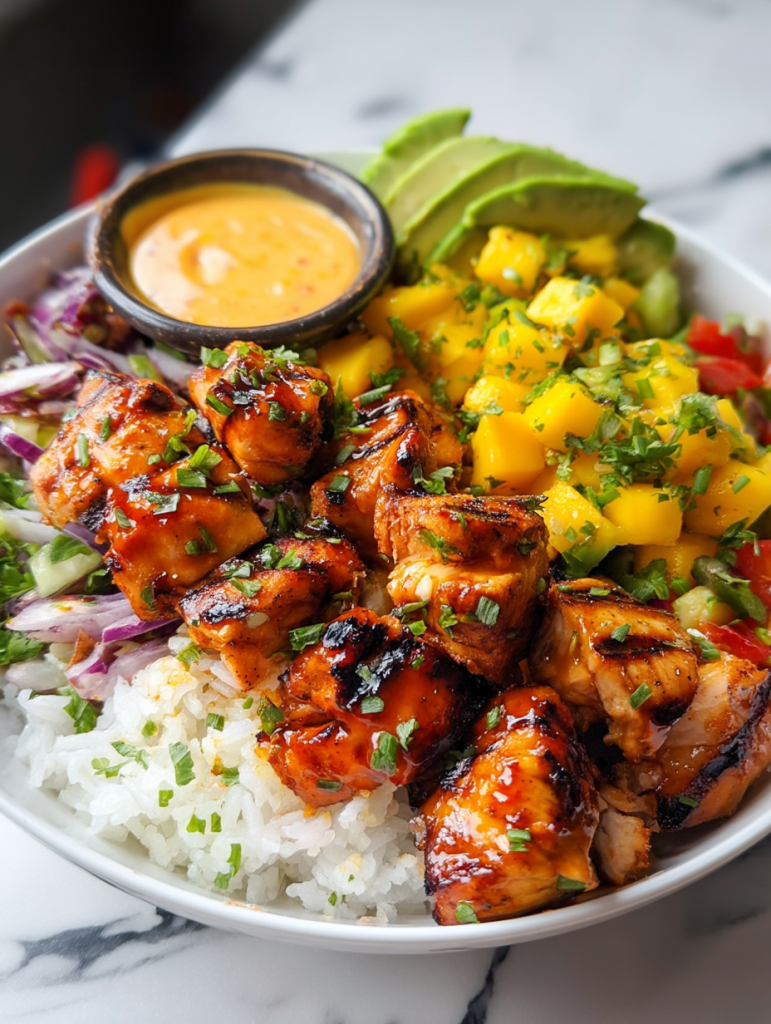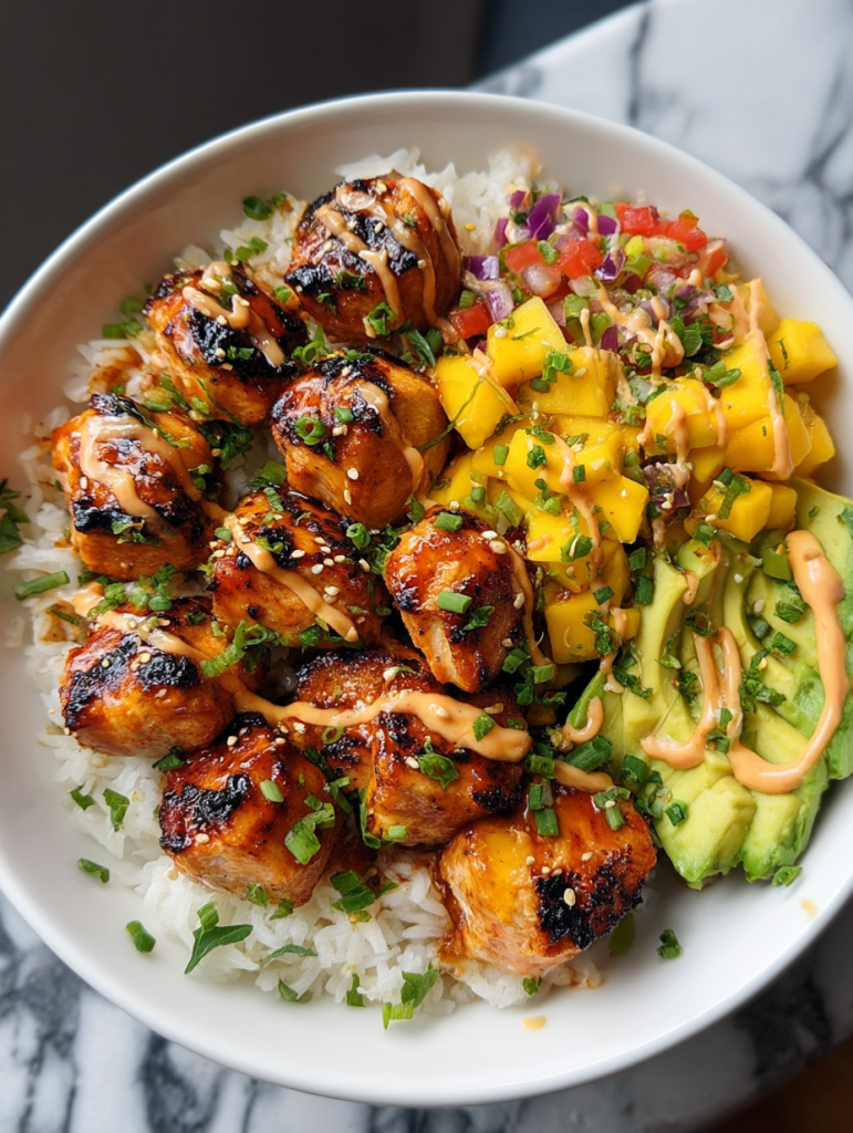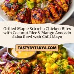 Craving something vibrant, zesty, and satisfying? This Grilled Maple Sriracha Chicken Bites Bowl is bursting with tropical flavor, creamy textures, and just the right kick of heat. Tender chicken bites are marinated in a sweet and spicy glaze, grilled to caramelized perfection, and nestled onto fluffy coconut rice. Each bowl is topped with juicy mango salsa, creamy avocado slices, and a drizzle of bold chili mayo for the ultimate flavor experience.