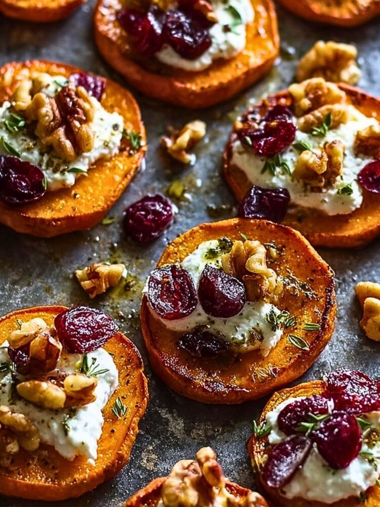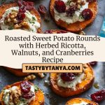 Sweet, savory, creamy, and crunchy — these Roasted Sweet Potato Rounds with Herbed Ricotta, Walnuts, and Cranberries are everything you want in a holiday appetizer or an elegant everyday side. Each bite delivers a perfect balance of flavors and textures: the caramelized roasted sweet potato, the creamy richness of herbed ricotta, the earthy crunch of toasted walnuts, and the burst of tart sweetness from dried cranberries.