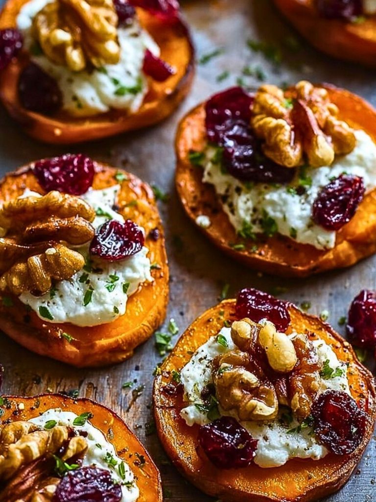 Roasted Sweet Potato Rounds with Herbed Ricotta, Walnuts, and Cranberries