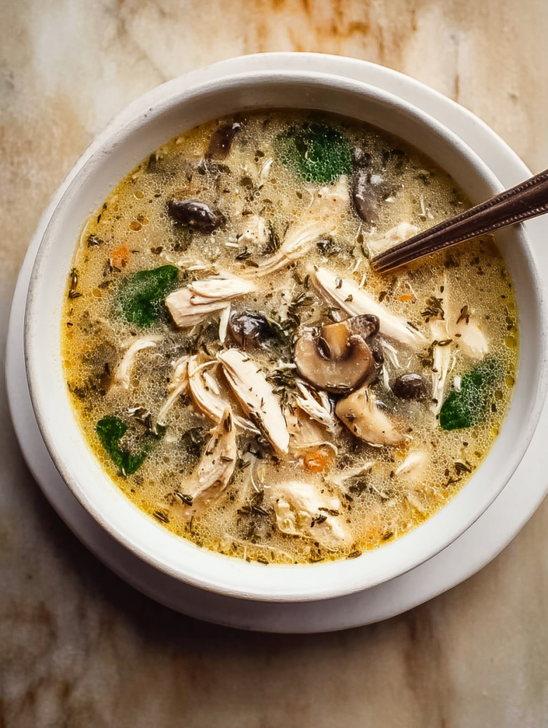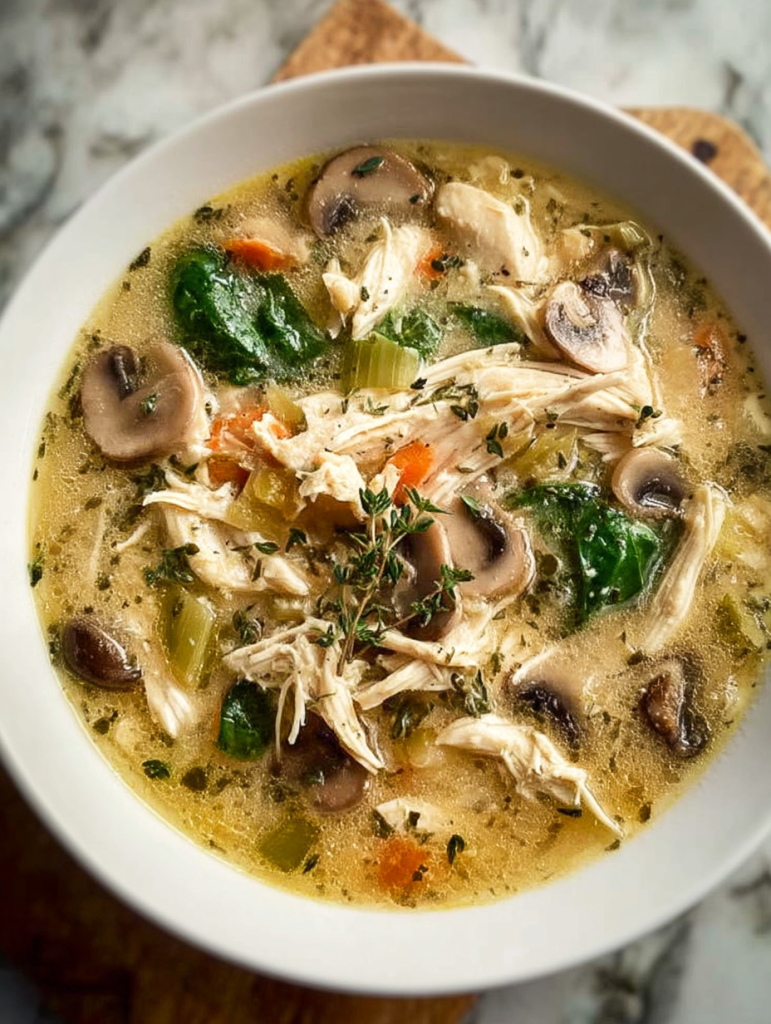 This soup is a weeknight lifesaver and a true comfort food classic. The deep umami of mushrooms, the ease of using pre-cooked chicken, and the creaminess of the broth all come together in a dish that feels both indulgent and wholesome. It’s also packed with nutrients from spinach and aromatics, making it a balanced meal.