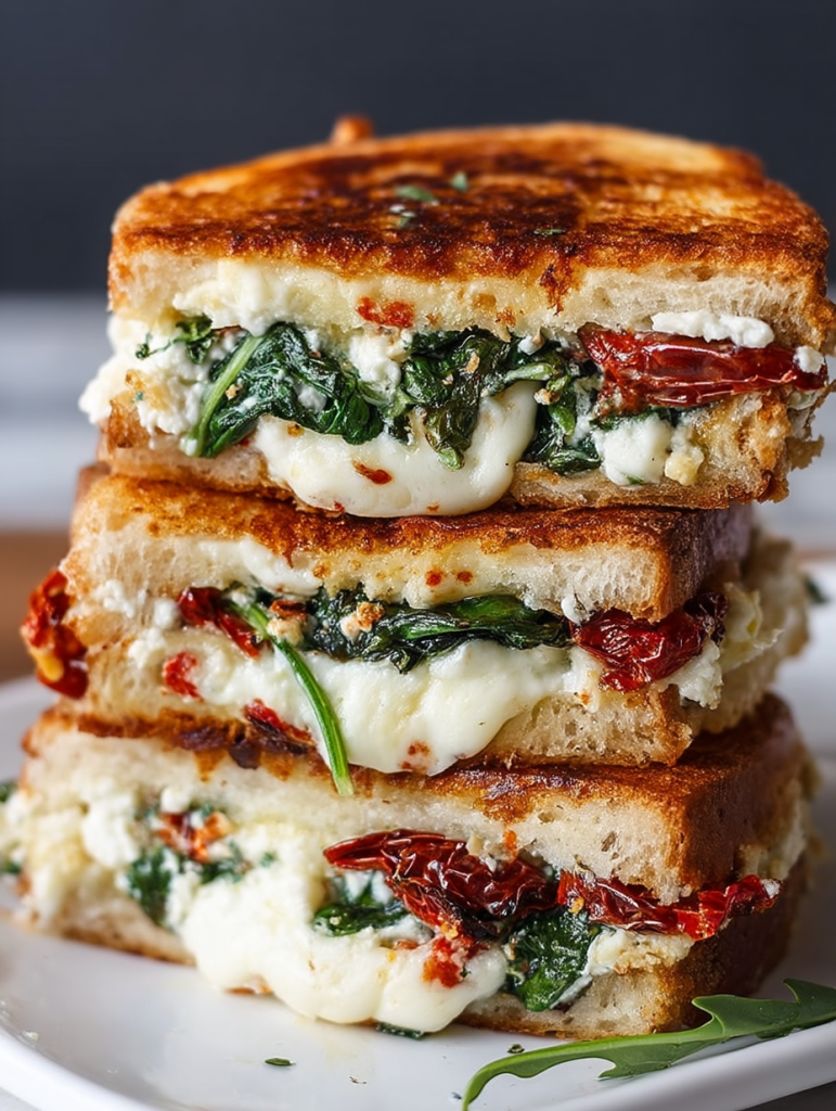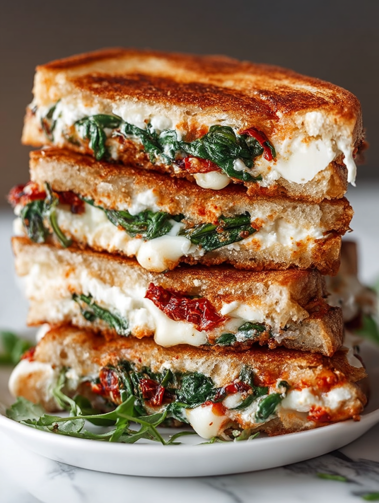Crispy, gooey, and packed with flavor—this Sun Dried Tomato Spinach and Ricotta Grilled Cheese isn’t your average sandwich. It’s an elevated twist on the childhood classic, combining creamy ricotta, melted mozzarella, garlicky sautéed spinach, and tangy sun-dried tomatoes between golden, buttery slices of sourdough bread. Perfectly satisfying for a quick lunch or a light dinner, this grilled cheese proves that simple ingredients can deliver bold, unforgettable taste.