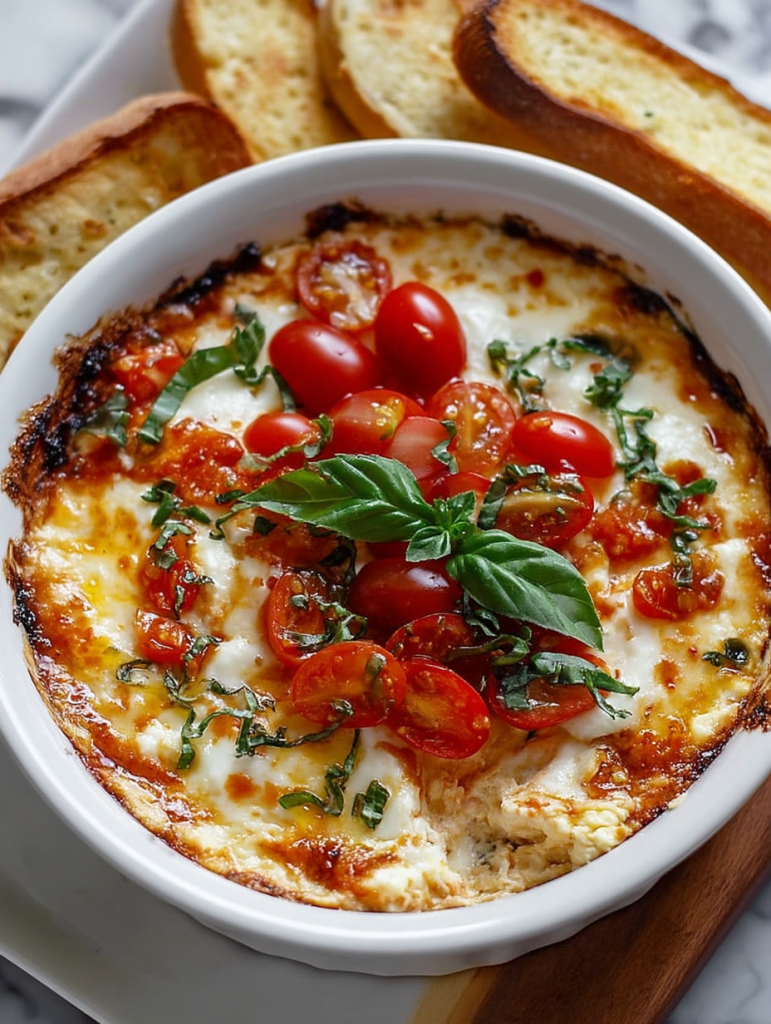 This dip is best enjoyed fresh and warm right out of the oven. The gooey cheese, warm tomatoes, and fresh basil are at their absolute peak just after baking. Serve it with toasted baguette slices, crostini, or hearty crackers.